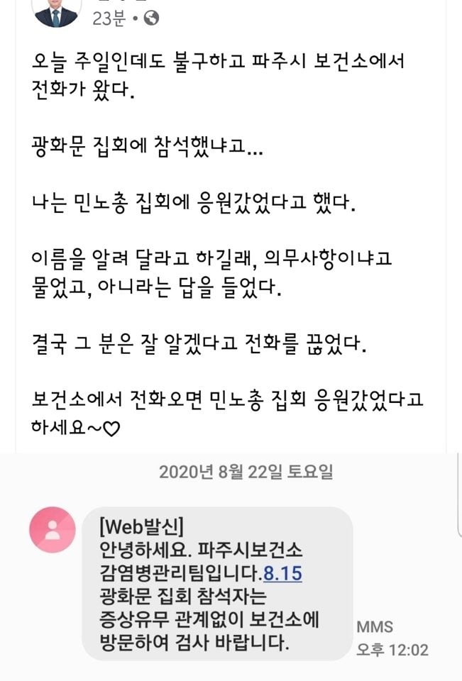 이날 한 SNS에 보수성향의 이용자가 "파주시 보건소에서 전화가 왔다. 광화문 집회에 참석했냐고. 나는 민노총 집회에 응원갔었다고 했다. 의무사항이냐고 물었고 아니라는 답을 들었다"는 내용의 글을 올렸다. 이 글은 SNS를 통해 퍼지고 있다.