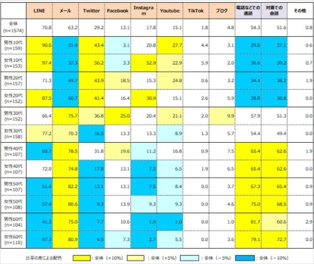 この調査は、LINEやFacbookなどの代表的なSNS(交流サイト)やメール、電話などでの通話、対面での会話といったコミュニケーション手段の利用率について、回答者の世代を10代から60代までの10歳刻みの年齢層に分け、男女別に集計している。