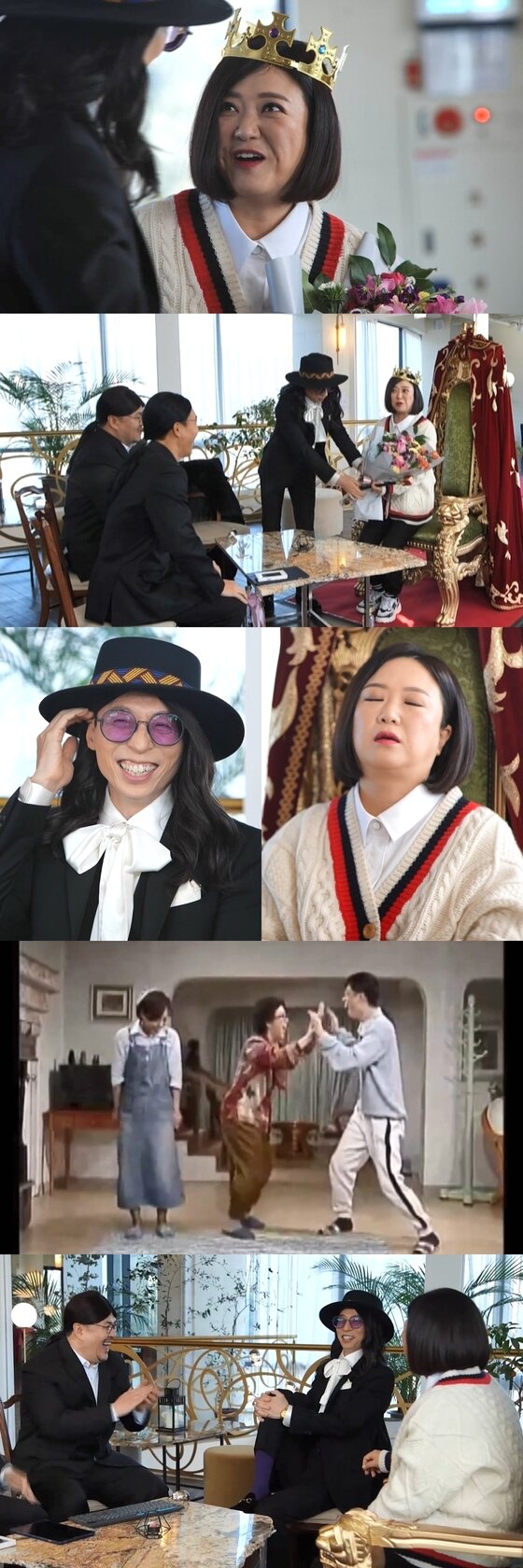 공개된 사진 속에는 2020년 KBS 연예 대상의 주인공 '갓숙' 김숙을 영접하는 카놀라 유와 영길, 동석의 모습이 담겨 눈길을 모은다. 대상의 품격에 맞게 거대한 예능의 왕좌, 꽃다발, 왕관까지 준비한 이들의 모습에 놀란 김숙의 모습이 보는 이들까지 흐뭇하게 만든다.