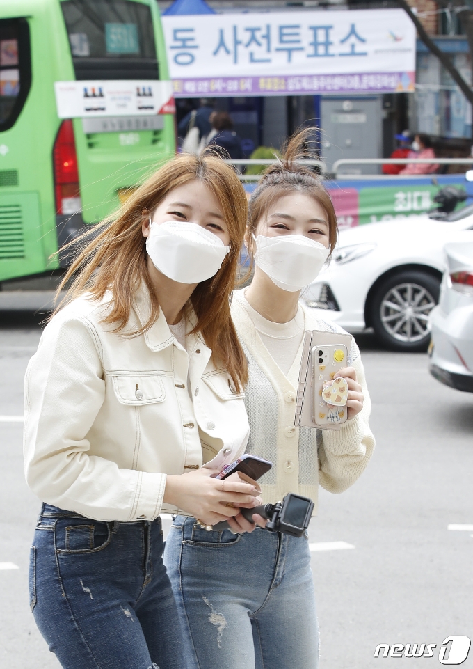 (서울=뉴스1) 권현진 기자 = 4·7 재·보궐선거 사전투표 첫날인 2일 서울 동작구 상도1동 주민센터에 마련된 투표소에 걸그룹 세러데이 하늘, 민서(왼쪽)가 서울시장 투표를 위해 들어서고 있다. 2021.4.2/뉴스1