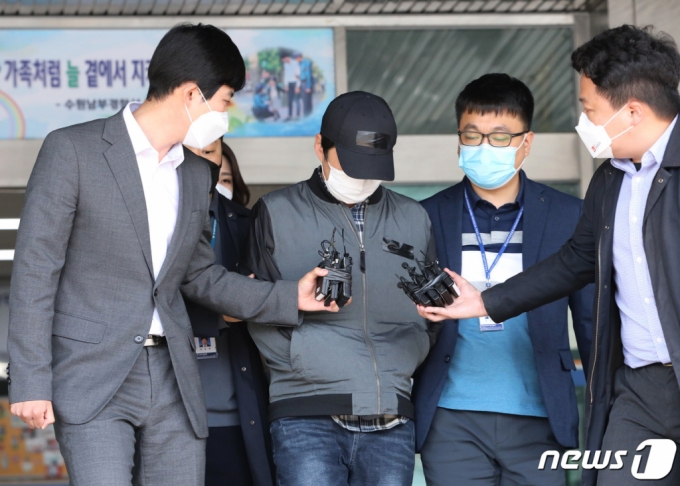 | '화성 2세 입양아 학대 사건'의 양부 C씨가 지난 11일 오후 경기도 수원시 영통구 수원남부경찰서에서 영장실질심사(구속 전 피의자 심문)를 받기 위해 호송차로 향하고 있다. /사진=뉴스1 |