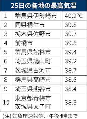北関東では午後も気温が上がり続け、群馬県桐生市で39.8度、栃木県佐野市では39.7度をそれぞれ観測。埼玉県鳩山町でも39度を超えた。38度となった茨城県筑西市など3地点で観測史上の最高気温となった。